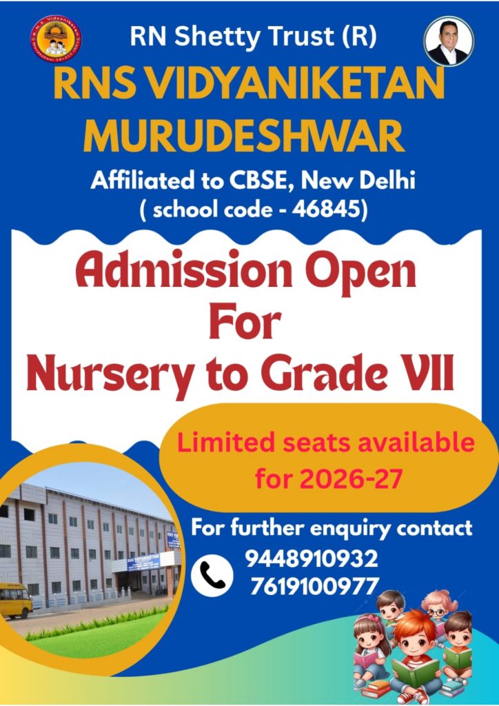 RNS Vidyaniketan was established by Dr. R. N. Shetty, the great industrialist of Murudeshwar with an intention to provide qualitative education to the people of the native and surroundings. It was first started with LKG and UKG in 2003-04, with meagre number of students and later on developed into full-fledged institution from LKG to X std in 2010-11. As it is felt that need of there is to have CBSE School, to enable the students to join mainstream of present higher education & compete for various competitive examinations…..